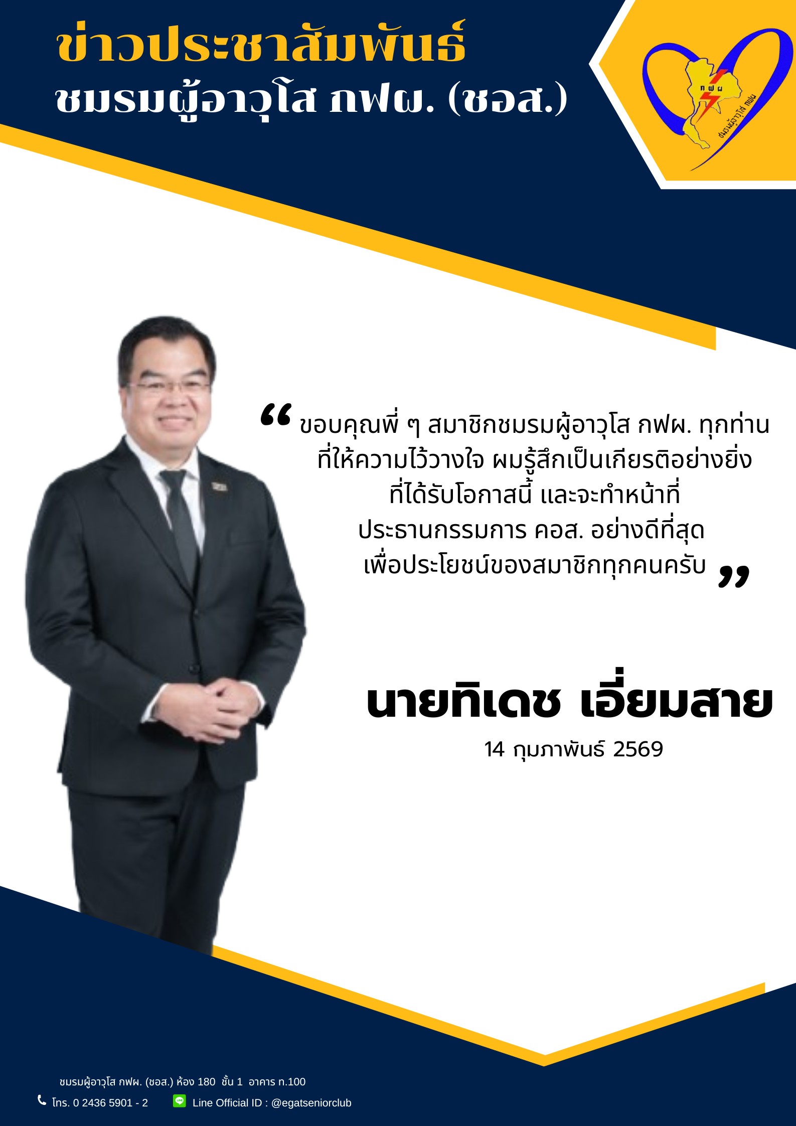 ประกาศคณะกรรมการบริหารงานชมรมผู้อาวุโส กฟผ. ที่ 1/2569 เรื่อง ผลการเลือกตั้งประธาน คอส.